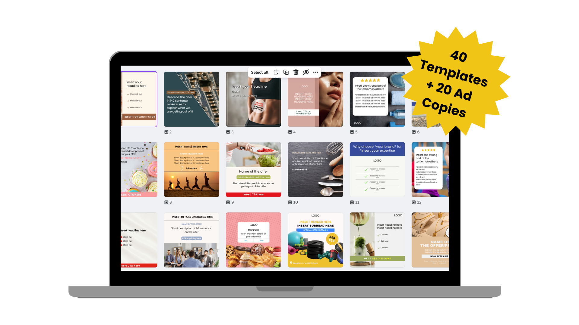 These are the exact visuals and copy templates I’ve used to generate real results for clients in all kinds of industries, and now, they’re ready for your next campaign.